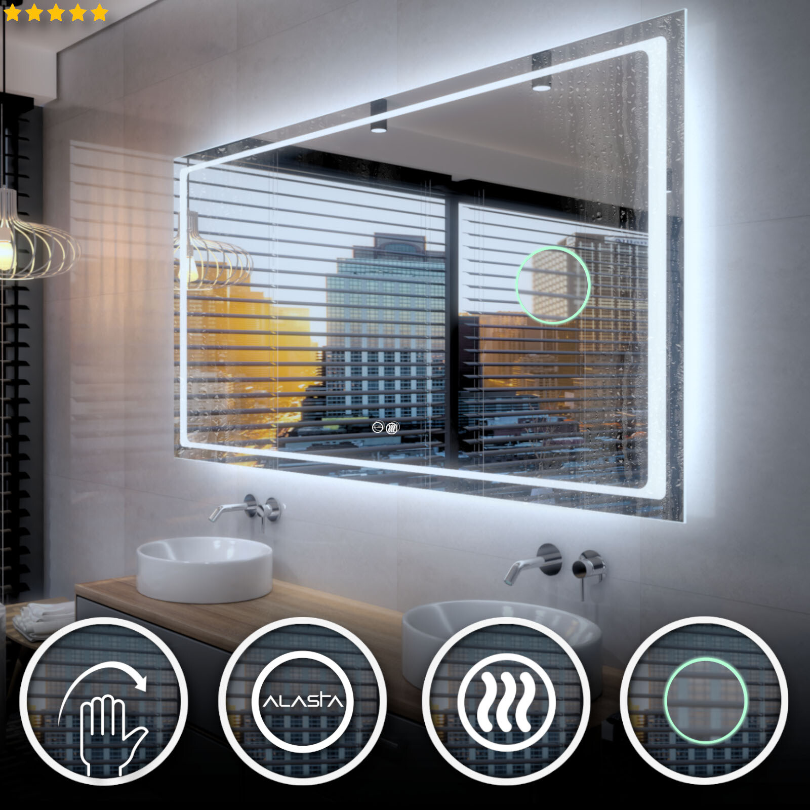 Miroir grossissant. vitre miroir AGC MIROX. L’épaisseur de la vitre miroir. 12V, intégrée, cachée derrière la vitre du miroir. ALASTA - Producent luster LED. Miroirs avec rétroéclairage LED. Empêche le miroir de s’embuer lors d’un bain intensif Installation dans la partie centrale du miroir Pour des raisons techniques, le tapis chauffant ne peut pas être installé sur toute la surface du miroir.