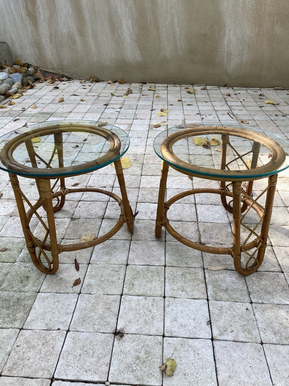 Paire De Table Basse Ronde En Rotin Et Verre Vintage 60/70’S