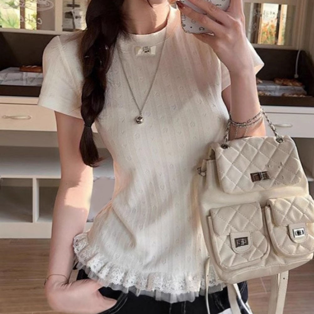 T-shirt femme été couleur unie dentelle épissée manches courtes coupe slim m