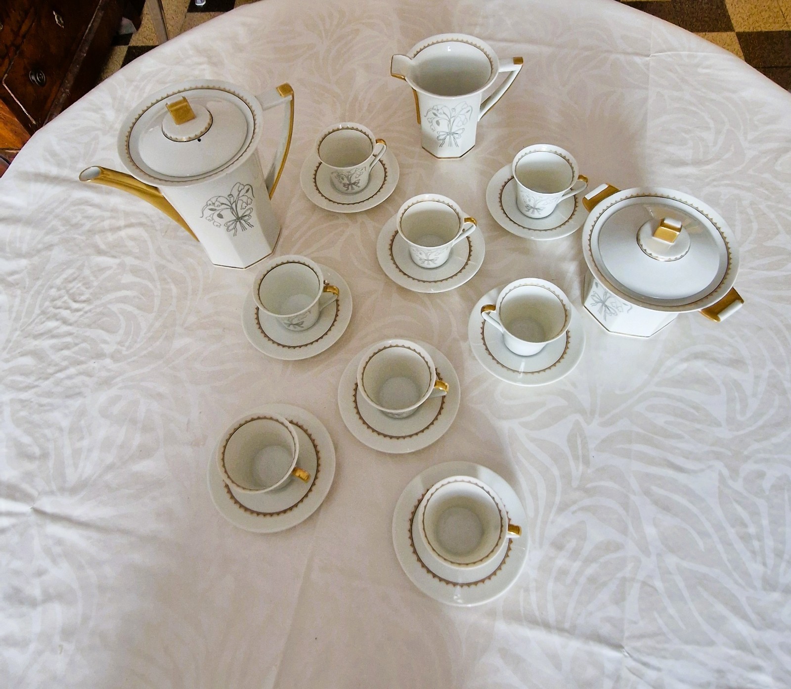 Très joli service à café 1. Le fond est blanc avec un décor de muguet et de dorure. Très bon état.
