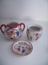 PORCELAINE FINE ASIATIQUE ENSEMBLE DE 3 THEIERE SUCRIER PICHET DESSIN JAPONISANT
