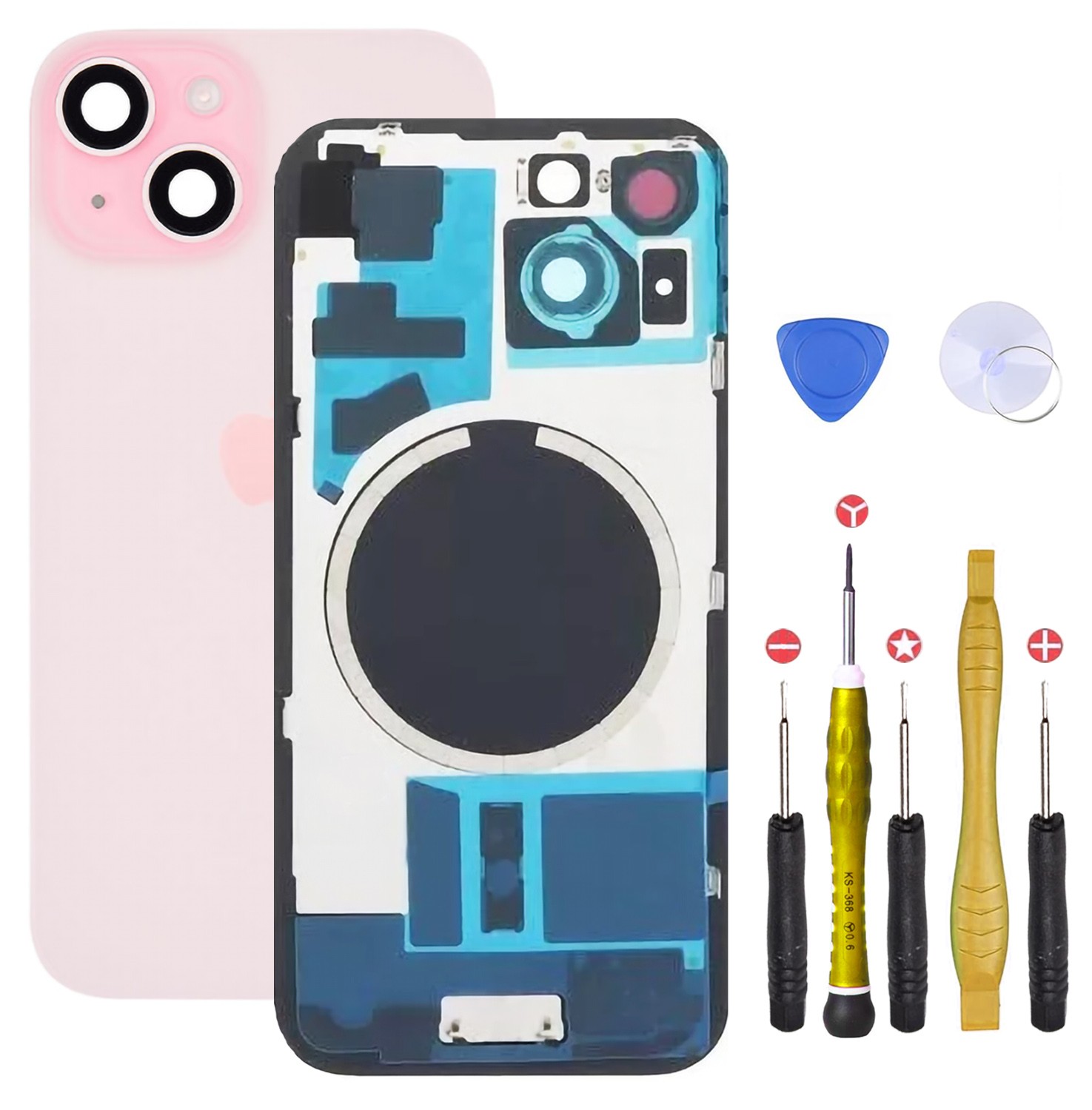 Vitre Arriere + Plaque metallique pour iPhone 15 Rose +Aimants et autocollant