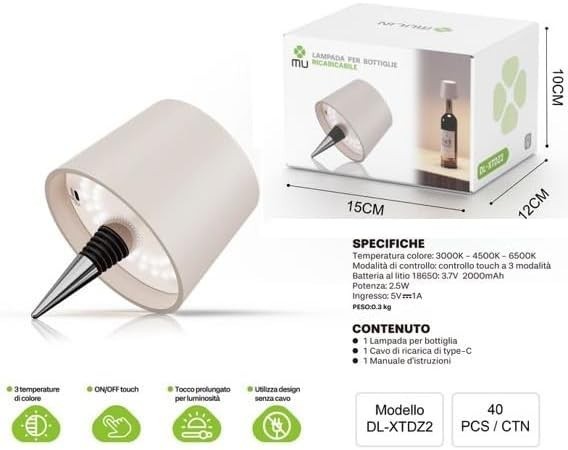 💡 Lampe bouteille rechargeable MU DL-XTDZ2 Blanc – Touchez 3 niveaux – LED 3000K / 4500K / 6500K Donnez de l'élégance et une lumière d'ambiance à vos espaces avec le Lampe bouteille MU DL-XTDZ2 dans couleur blanche. Un accessoire innovant et raffiné, idéal pour les maisons, les restaurants et les clubs grâce à son conception compacte et au batterie rechargeable ce qui garantit des heures d’autonomie sans câbles. 3 températures de couleur : 3000K (chaud), 4500K (neutre), 6500K (froid) Contrôle tactile : marche/arrêt et réglage de l'intensité Batterie rechargeable: Batterie Li-Ion 18650 2 000 mAh (3,7 V) Chargement USB Type-C : compatible avec les adaptateurs, les PC et les banques d'alimentation ✅ Rechargeable et sans fil – liberté d'utilisation maximale 🛒 Ajoutez une t.