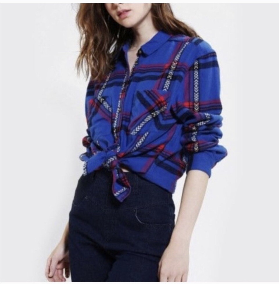 BDG Urban Outfitters Long Sleeve Plaid Flannel Shirt. Blue, red, & aztec printed plaid button down. White and black arrow stitch design accents Buttons & collar, cuffed sleeves. Fall Boho Western Bohemian Autumn Comfy Cozy Casual.