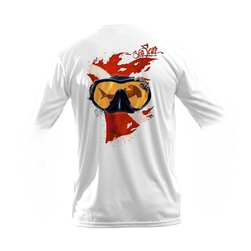 Masque de plongée Sea Fear à manches courtes Performance Tee Masque de plongée conçu sur un t-shirt à manches longues haute performance ! Le processus utilisé pour imprimer cette chemise est une technologie de pointe ! L'image sur ce t-shirt est la qualité d'une caméra haute résolution ! Couleurs vives lavage après lavage. L'encre est infusée dans les fibres de la chemise, ce qui donne un imprimé ultra doux qui ne vous colle pas dans la chaleur de l'été. Protection solaire UPF 50+. Vous pouvez nager, plonger, pêcher ou simplement vous détendre dans ces tees. Évacuation de l'humidité, séchage rapide, confort et protection solaire.
