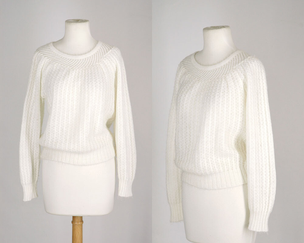 Vintage 70s White MEDIUM Pointelle Sweater White Grandma Knit Sheer Spring 1970s
