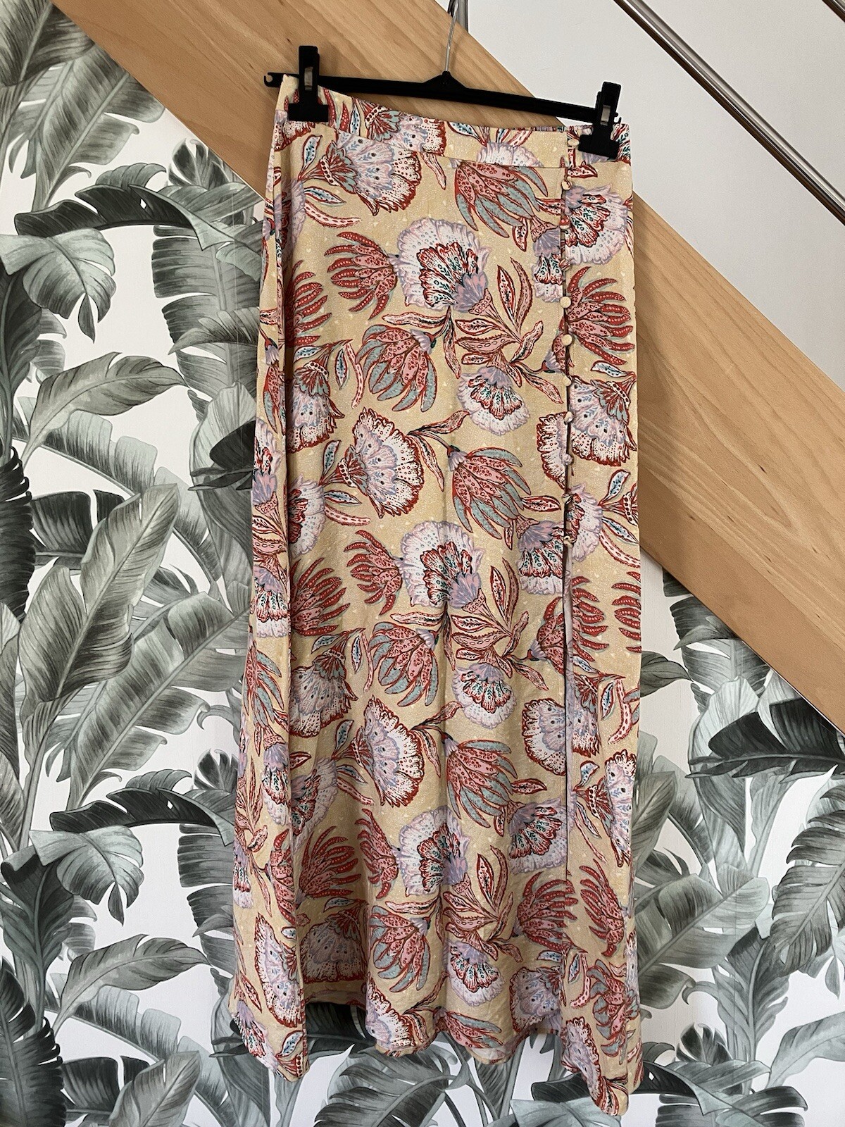 Jupe longue-imprimés fleuris-tons pastel-Atelier Rêve. Belle jupe longue imprimés fleurs dans les tons pastel jaune orangé En bon état : elle a été portée mais ne présente pas de défauts. Marque : Atelier Rêve, jupe élégante, de belle facture. Élastique à la taille uniquement dans le dos À l’avant : fente sur 53 cm surmontée de 11 petits boutons Tissu léger : 85%viscose et 15%nylon Dimensions : - du haut de la taille au bas : 94 cm environ - Taille : 36 cm ⚠️ Pas de photo portée