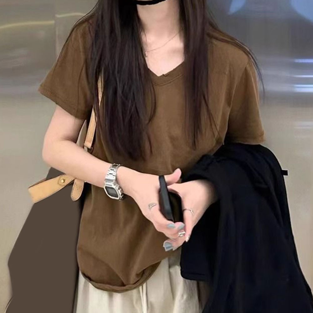 T-shirt femme décontracté été couleur unie col V ample manches courtes haut