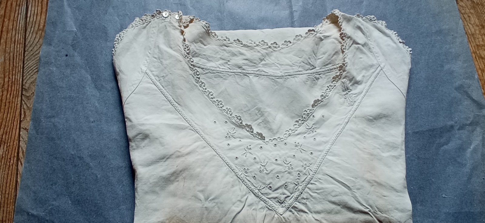 Ancienne Chemise de nuit femme avec broderies Entre le bas des emmanchures :57 cm Longueur :89 cm 2 petits boutons ferment la bretelle. A relaver,traces de pliures,sortie telle qu'elle du grenier..