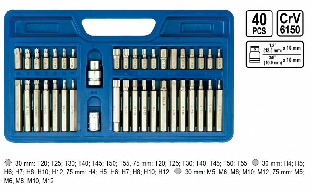 Bitsatz Torx Multi -Tooth Interior SexccEd 1/2 3/8 pouces 40 tlg Bitsatz Torx Multi -Tooth Interior SexccEd 1/2 3/8 pouces 40 tlg Tailles: Inbus: H 4 - H 5 - H 7 - H 8 - H 10 - H 12, TORX: T 20 - T 25 - T 30 - T 40 - T 45 - T 50 - T 55, Divers dent: m 5 - M 6 - M 8 - Longueur : 30 et 75 mm chacun Enregistrement de bits 1/2 "x 10 mm Entièrement fabriqué en acier au chrome vanadium CrV 6150 Pour tous les cliquettes et tournevis avec 1/2 "et 3/8. Pour tous les travaux sur l'arbre d'entraînement ou Carte - Prise intérieure: H 4 - H 5 - H 6 - H 7 - H 8 - H 10 - H 12 Torx : T 20 - T 25 - T 30 - T 40 - T 45 - T 50 - T 55 Multi-dents : M 5 - M 6 - M 8 - M 10 - M 12 Enregistrement de bits 1/2 "x 10 mm Entièrement fabriqué en acier au chrome vanadium CrV 6150 Copyright 2021 Tooltraders GmbH Tous.