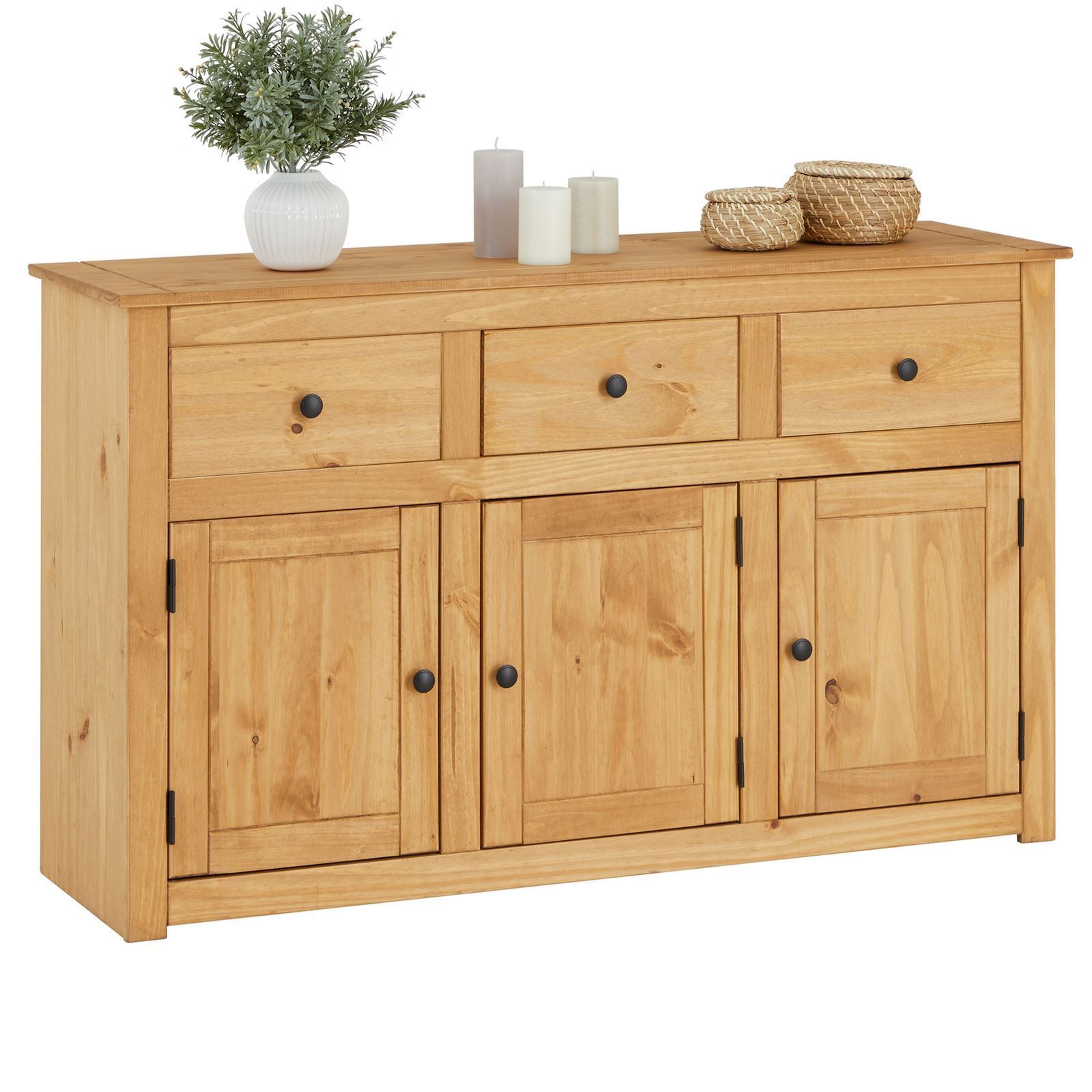Dimensions (L x H x P) : 135 x 80 x 40 cm Fabriqué en pin massif, finition teintée/cirée Avec 3 tiroirs et 3 portes battantes Poignées bouton en métal Collection CANCUN .
