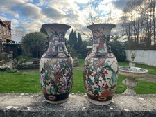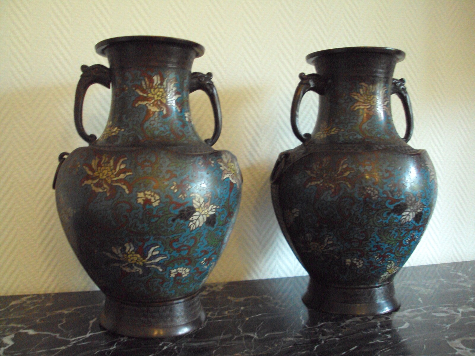 ANCIENNE PAIRE DE VASE EN BRONZE DE FORME BALUSTRE A DECOR D'EMAUX CHAMPLEVES DE