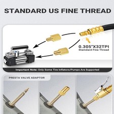 Convient aux marches de capuchon de valve standard. Capuchon de retrait de noyau de valve en métal. Extension de tige de valve de pneu 2 pièces. Tuyau flexible tressé en acier. Idéal pour les camions, les camping-cars et les jantes à double pneu.
