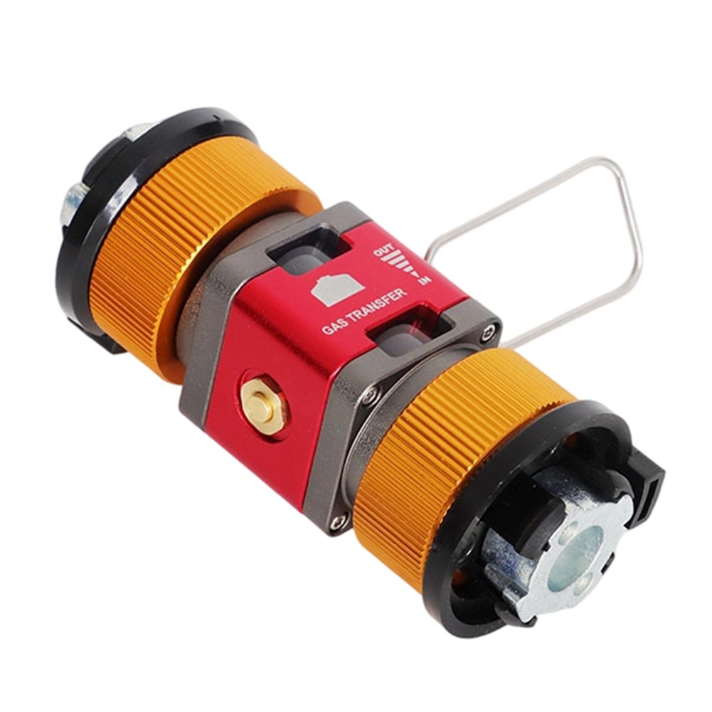 Visual gas tank converter. Comprend un convertisseur de réservoir de gaz à cassette pour le remplissage avec des réservoirs de gaz plats ou d'autres réservoirs de gaz similaires. Compatible avec les réchauds de camping, les radiateurs et les lanternes.