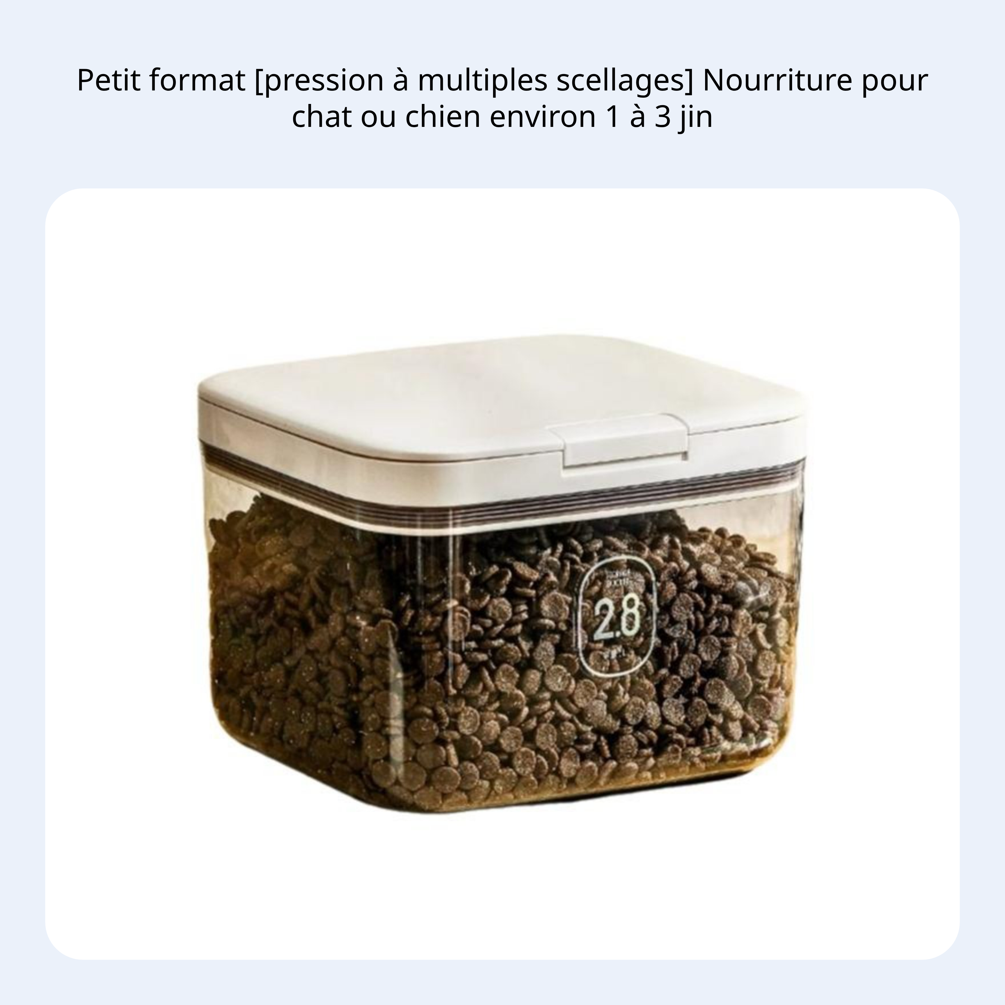 Lot de deux boîtes de conservation pour aliments pour animaux, idéal pour croquettes, friandises ou snacks. Conception étanche et anti-humidité pour garder la nourriture fraîche. Fabriqué en ABS et PP de qualité alimentaire, sûr et durable. Système de fermeture innovant avec joint en silicone et clips solides pour une protection optimale. Couvercle facile à ouvrir et fond plat pour un nettoyage rapide. Plusieurs capacités disponibles, certains modèles avec boîte à déshydratant et doseur pour un service précis.
