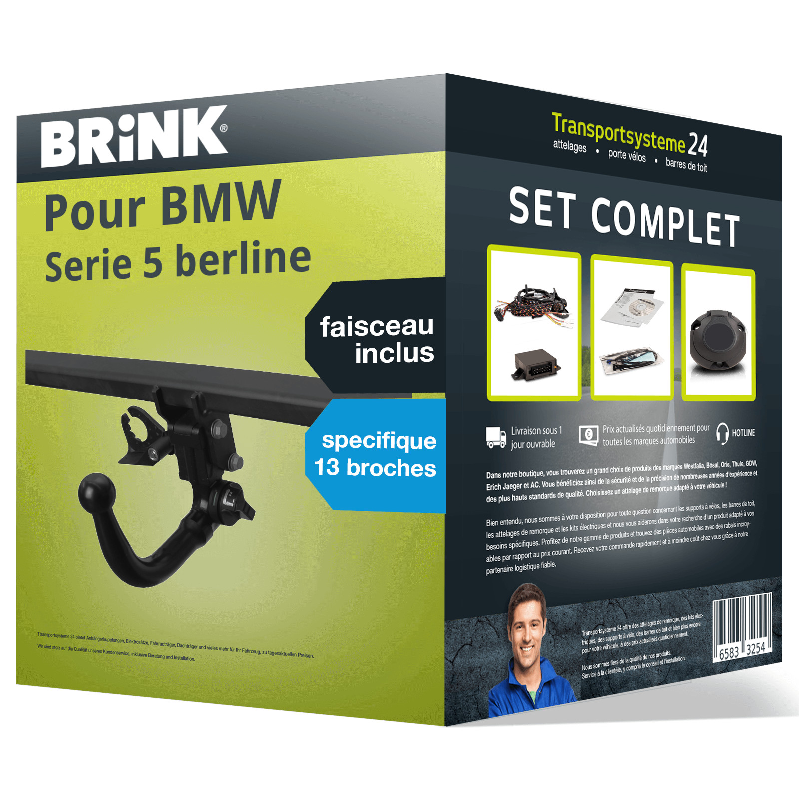 PACK COMPLET pour BMW Serie 5 berline 02.2017 - à ce jour, composé d'un attelage rotule démontable Brink et d'un faisceau 13 broches Spécifique au véhicule ECS Electronics. D’autres informations produit importantes consultables dans la notice de montage - veuillez cliquer sur le lien!.