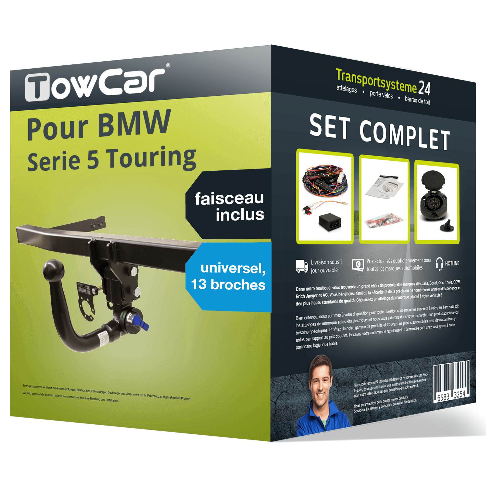 PACK COMPLET pour BMW Serie 5 Touring 06.2017 - à ce jour, composé d'un attelage rotule démontable TowCar et d'un faisceau 13 broches universel TowTec. D’autres informations produit importantes consultables dans la notice de montage - veuillez cliquer sur le lien!.