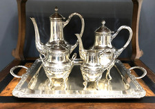 Service à café / thé ERCUIS 4 pièces + plateau de service. 53 cm de longueur poignées comprises. 43 cm de longueur sans les poignées. 33 cm de largeur. Aucune déformation ni désargenture. Très bel état.