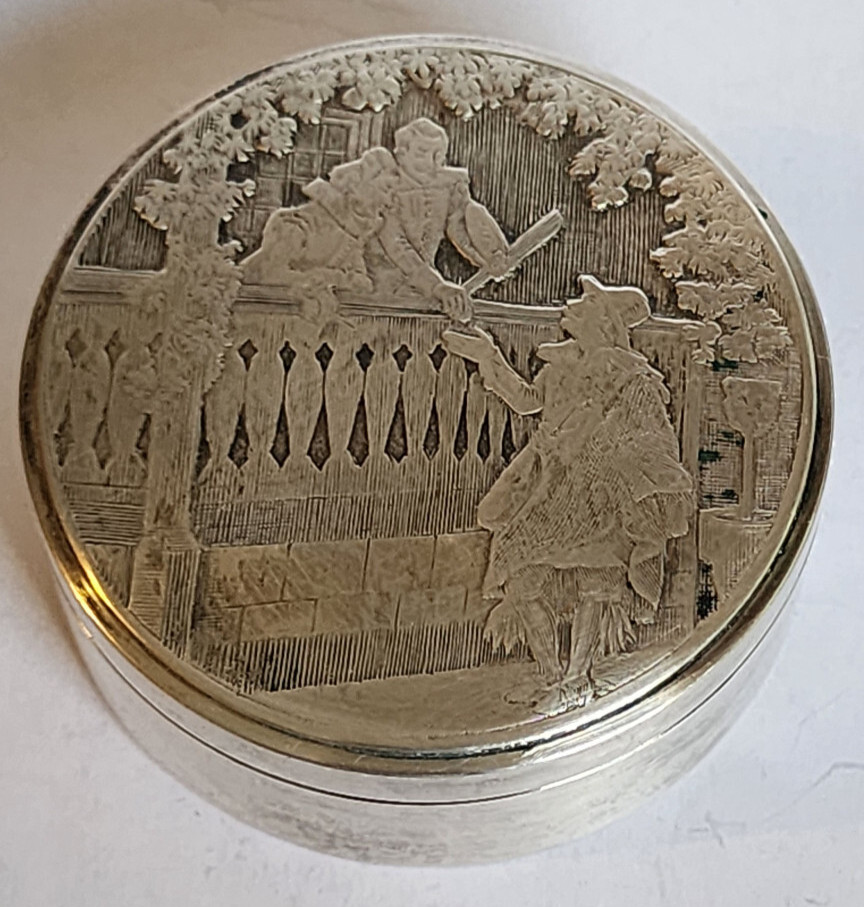 Grande Boite à Bonbons, Cachous, Pilules ancienne, en Métal argenté. gravée d'une Scène romantique avec trois Personnages sur le Couvercle. Hauteur: 2,5 cm.