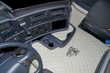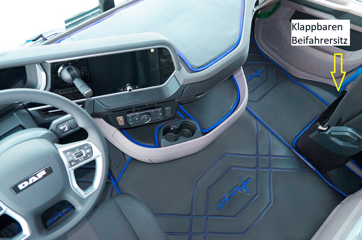 Couverture de tunnel de tapis de sol de camion g simili cuir Noir/Bleu convient à DAF XG [nouveau] à partir de 2022 Transmission automatique Siège passager pliable Le tapis de voiture est en cuir synthétique de haute qualité (cuir écologique). Contrairement à d'autres jeux de tapis de sol, celui-ci couvre tout le sol de la cabine du conducteur. Il donne un nouveau look à l'intérieur de la cabine de conduite et vous offre un confort de conduite inoubliable en réduisant le bruit (notamment le bruit du moteur). Haute qualité de production Nettoyage facile 1. Le paillasson matelassé convient à : Daf XG à partir de 2022 2.
