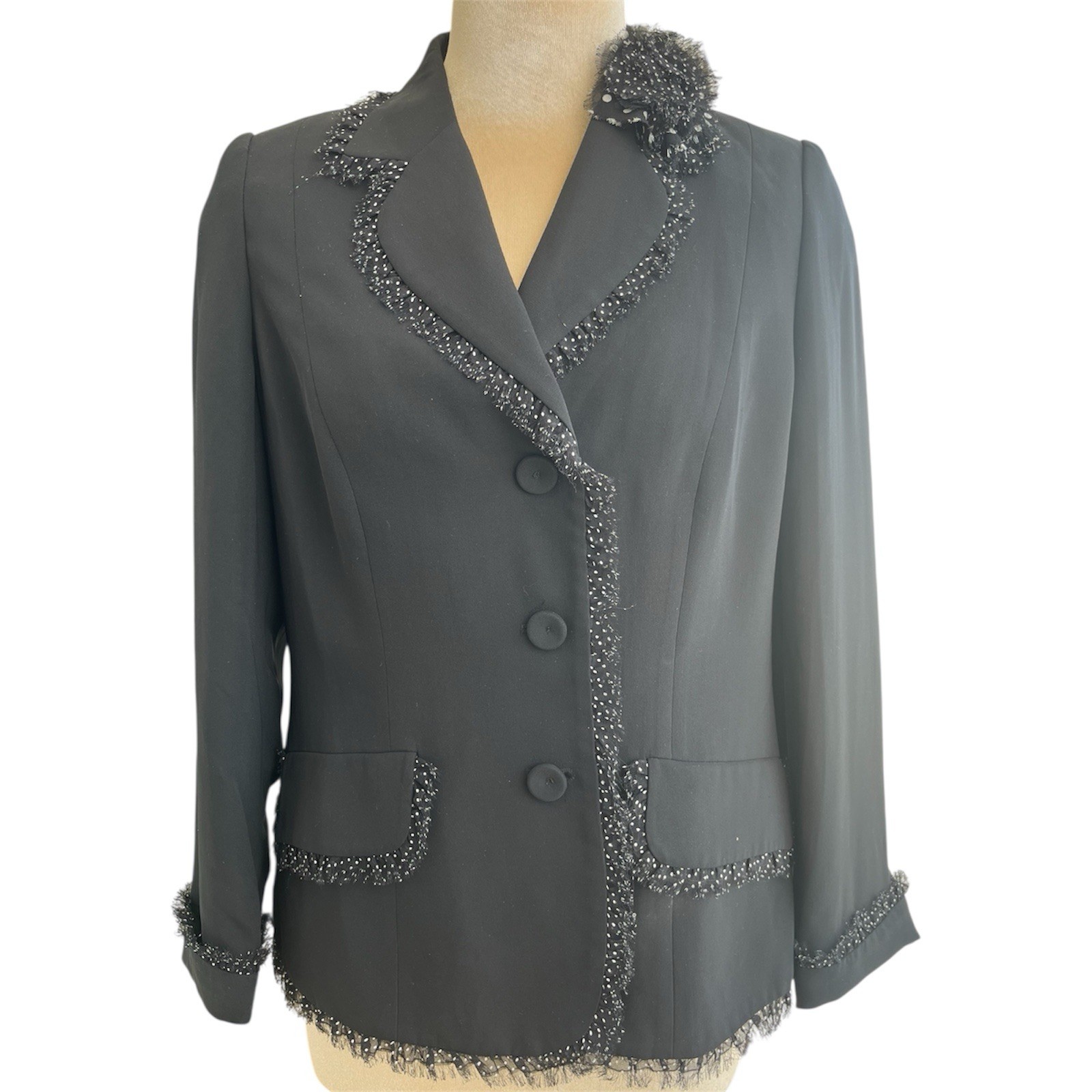 Louisa Spagnoli Blazer Femme Vintage Noir Ornée D’une Fleur Au Col 100 % Soie. Dimensions:: 50 IT 46 FR État :: parfait état