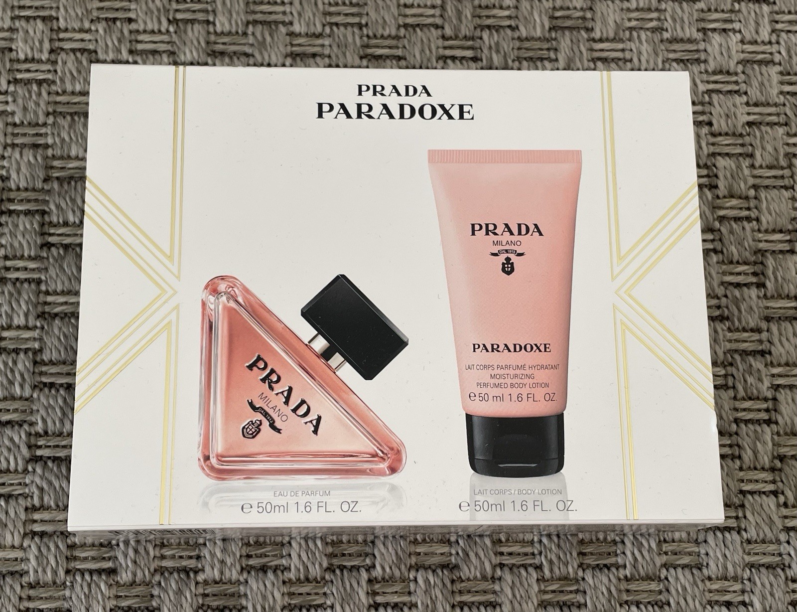 Coffret Prada paradoxe neuf. Contient 1 eau de parfum 50ml + 1 lait corps parfumé hydratant 50ml.