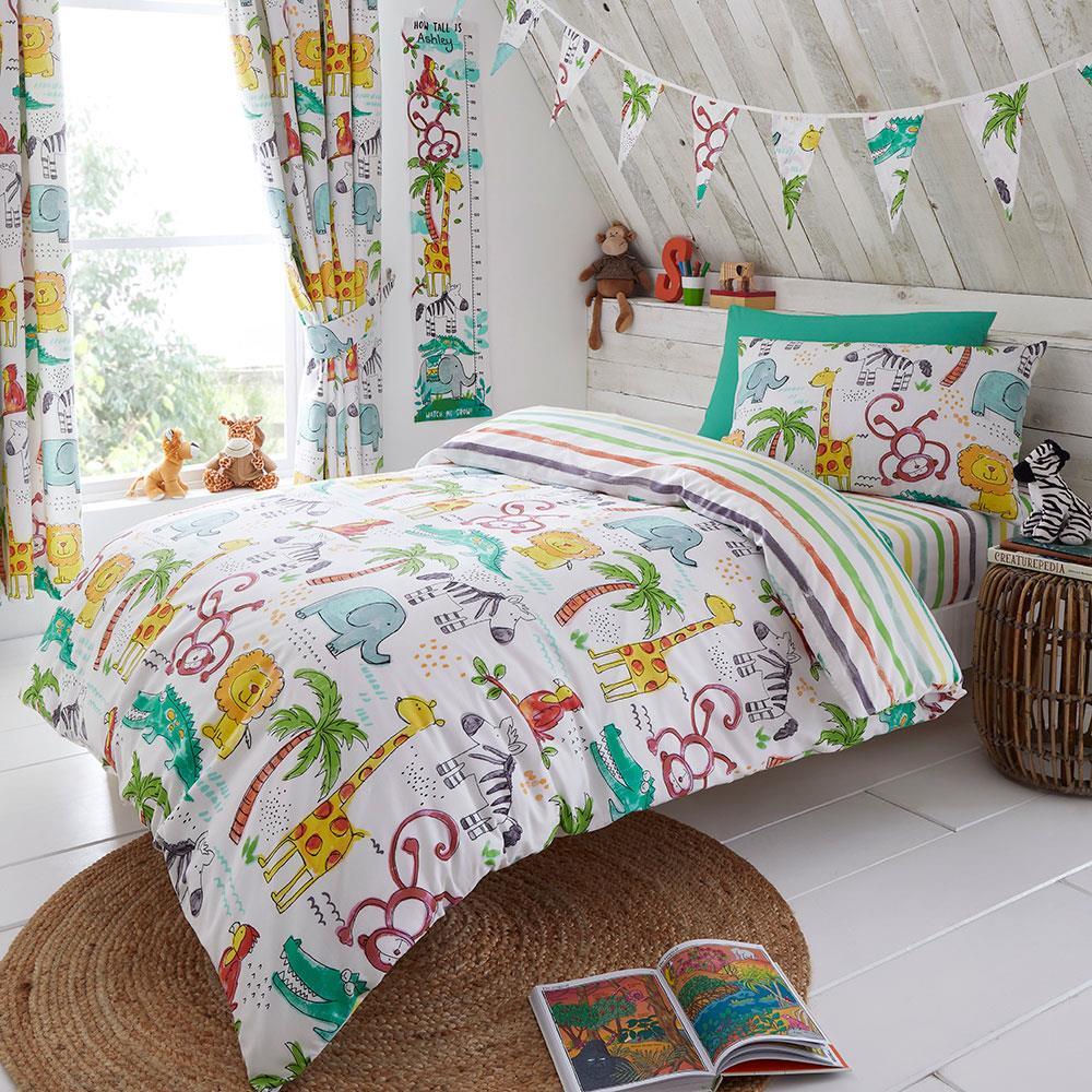 Nous avons en stock une vaste gamme de produits liés au personnage et au football, notamment de la literie, des serviettes, des tapis et bien plus encore. Nous sommes également l'une des plus grandes marques de papiers peints sur eBay - Tout ce dont vous avez besoin pour une chambre à thème pour votre tout-petit ainsi qu'une maison confortable et élégante. Cet ensemble de housse de couette junior Jungle Fun est parfait pour la chambre à thème safari de vos tout-petits. La conception présente des illustrations de palmiers, de girafes, de zèbres, de lions, d'éléphants, de singes, de crocodiles et de perroquets, placés sur un fond blanc ordinaire. Le revers présente un motif à rayures colorées, sur un fond blanc uni. Cet ensemble de literie est fabriqué à partir d'un mélange de polycoton et p.