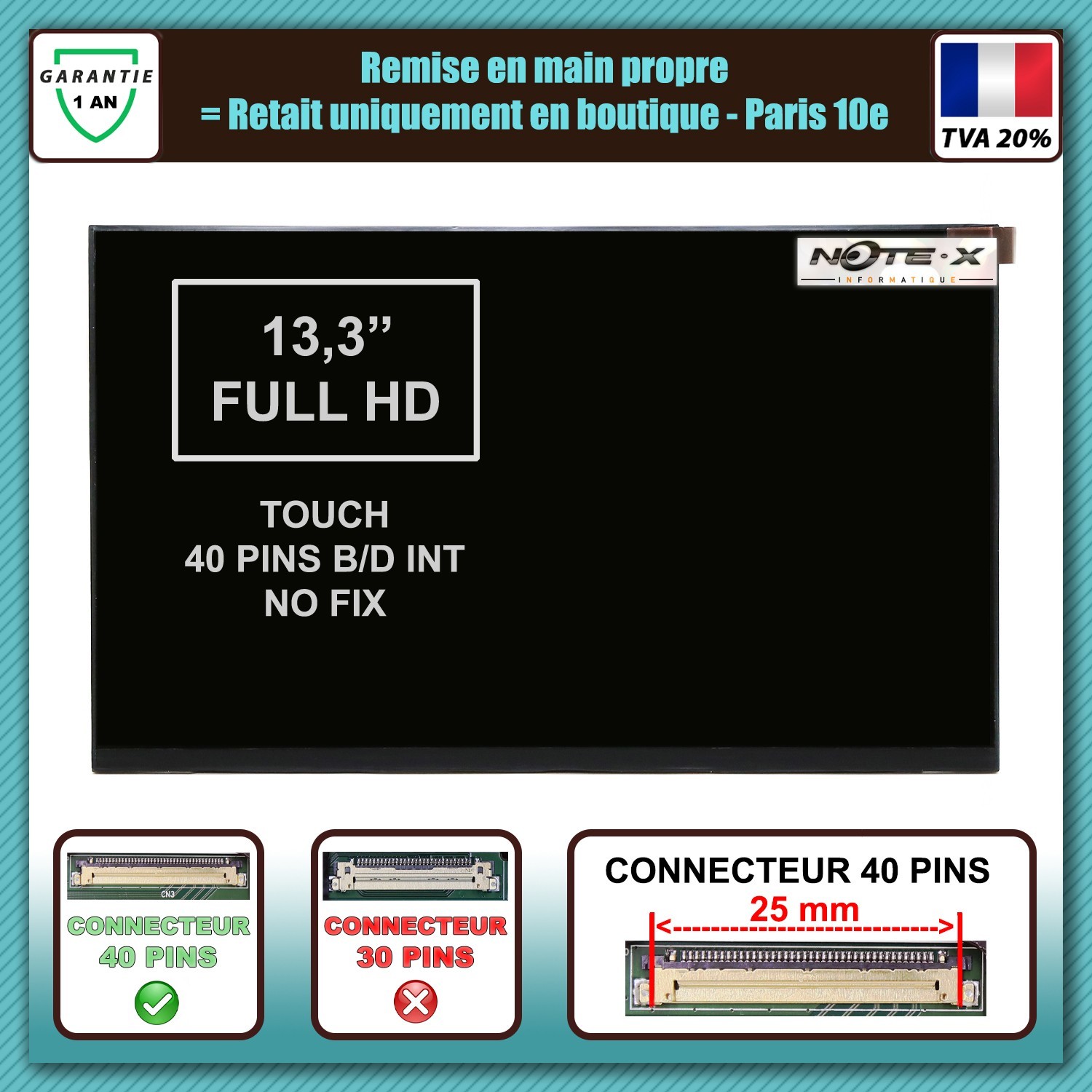 ⭐Écran BOE NV133FHM-T0A – 13,3″ Full HD – Tactile In-Cell – eDP 40-pins. Idéal pour remplacer un écran cassé, fissuré, tactile HS ou affichage défectueux. Tactile : Oui – In-Cell / Touch intégré. Interface : eDP – 40 pins.