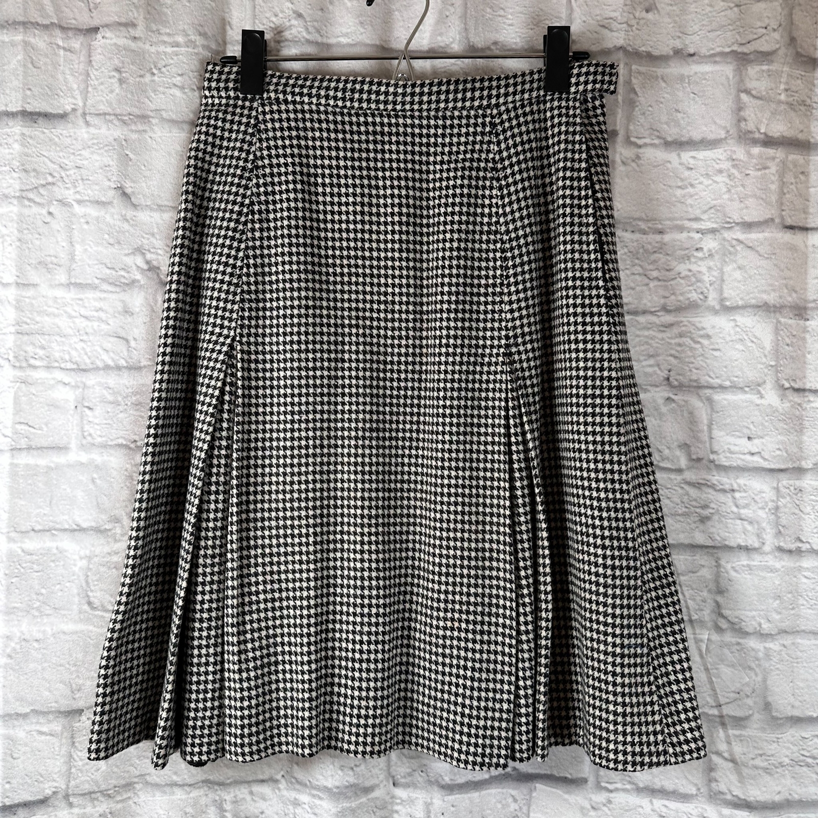 DESCRIPTION:Jupe au-dessus du genou avec imprimé pied-de-poule, bas plissé et fermeture zippée/auto-agrippante TAILLE DU TAG:Pas d'étiquette de taille mais mesure comme une petite taille, voir les mesures CONDITION: Utilisé mais pas abusé, pas de déchirures, de trous ou de taches MATERIEL:Pas d'étiquette de matériau, ressemble à un mélange de laine COULEUR: Pied-de-poule noir et blanc MESURE DE LA TAILLE À L'OURLET:23,5" (60 cm) MESURE DE LA TAILLE: 29" (74cm) MARQUE: Fait main Services de liste et de modèles fournis par inkFrog.