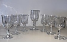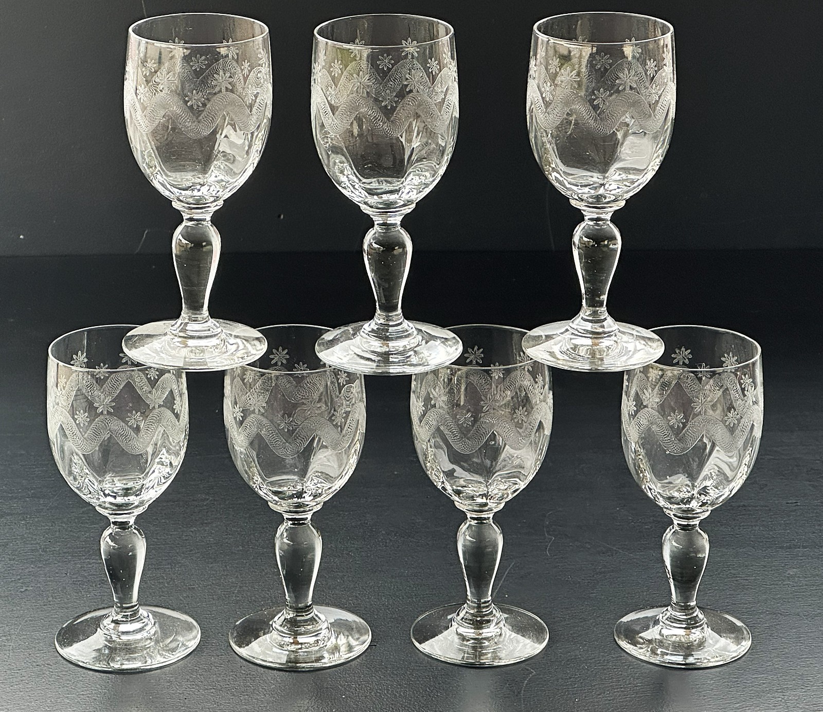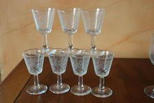 7 anciens verres à Vin blanc ou porto, modèle à frises ondulées et fleurs.