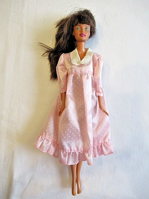 Barbie avec chevelure châtain. Elle porte une chemise de nuit rose à pois blancs. Manches froncées mi-longues, col en feutrine blanche, plis à partir du dessous de la poitrine et volant au bas.