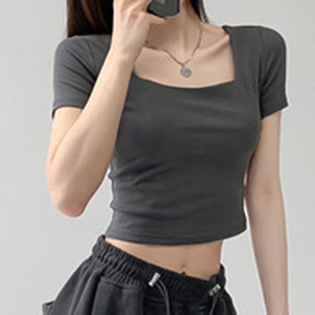 T-shirt femme été col U uni manches courtes basique hauts par temps chaud