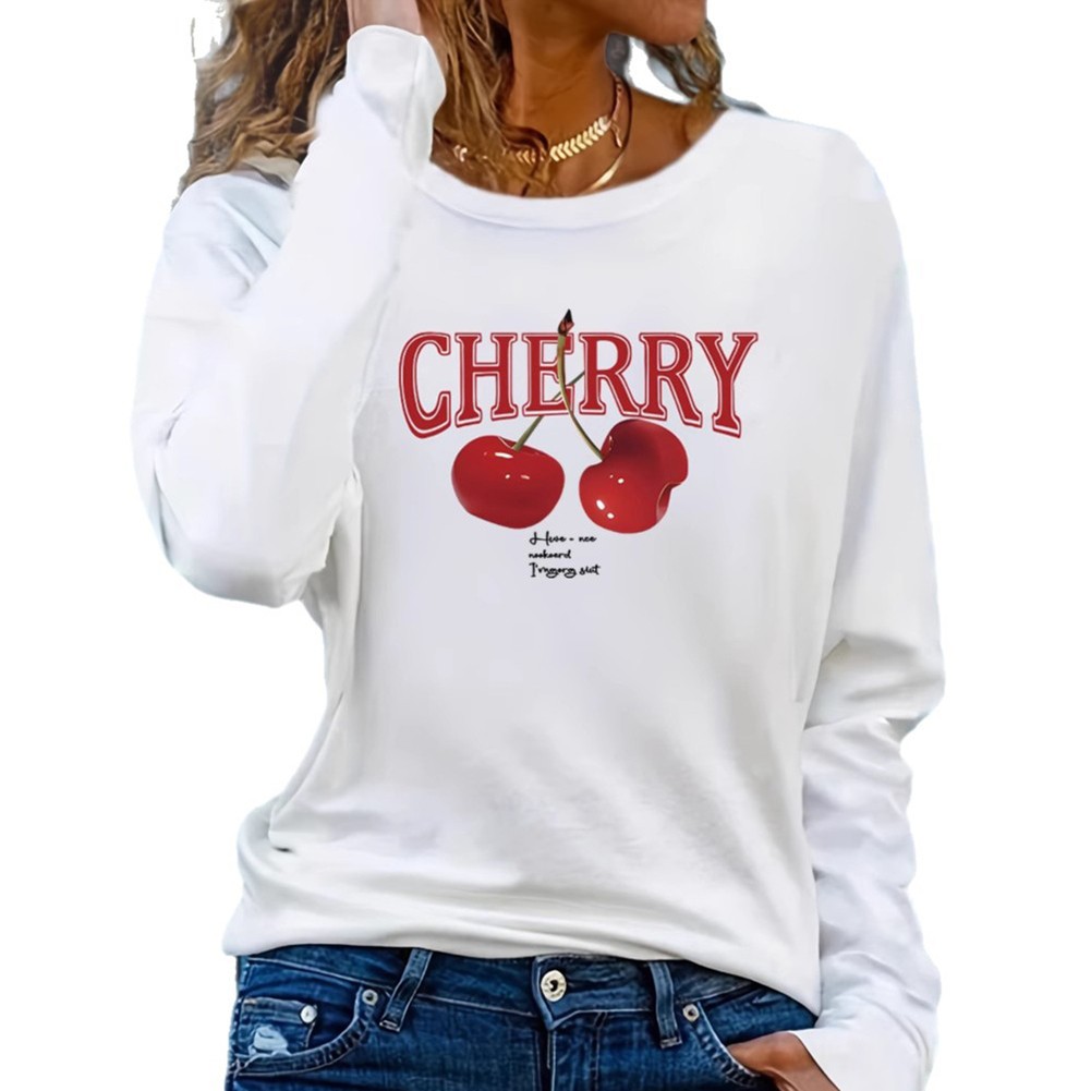 T-shirt femme col rond manches longues imprimé cerise printemps été