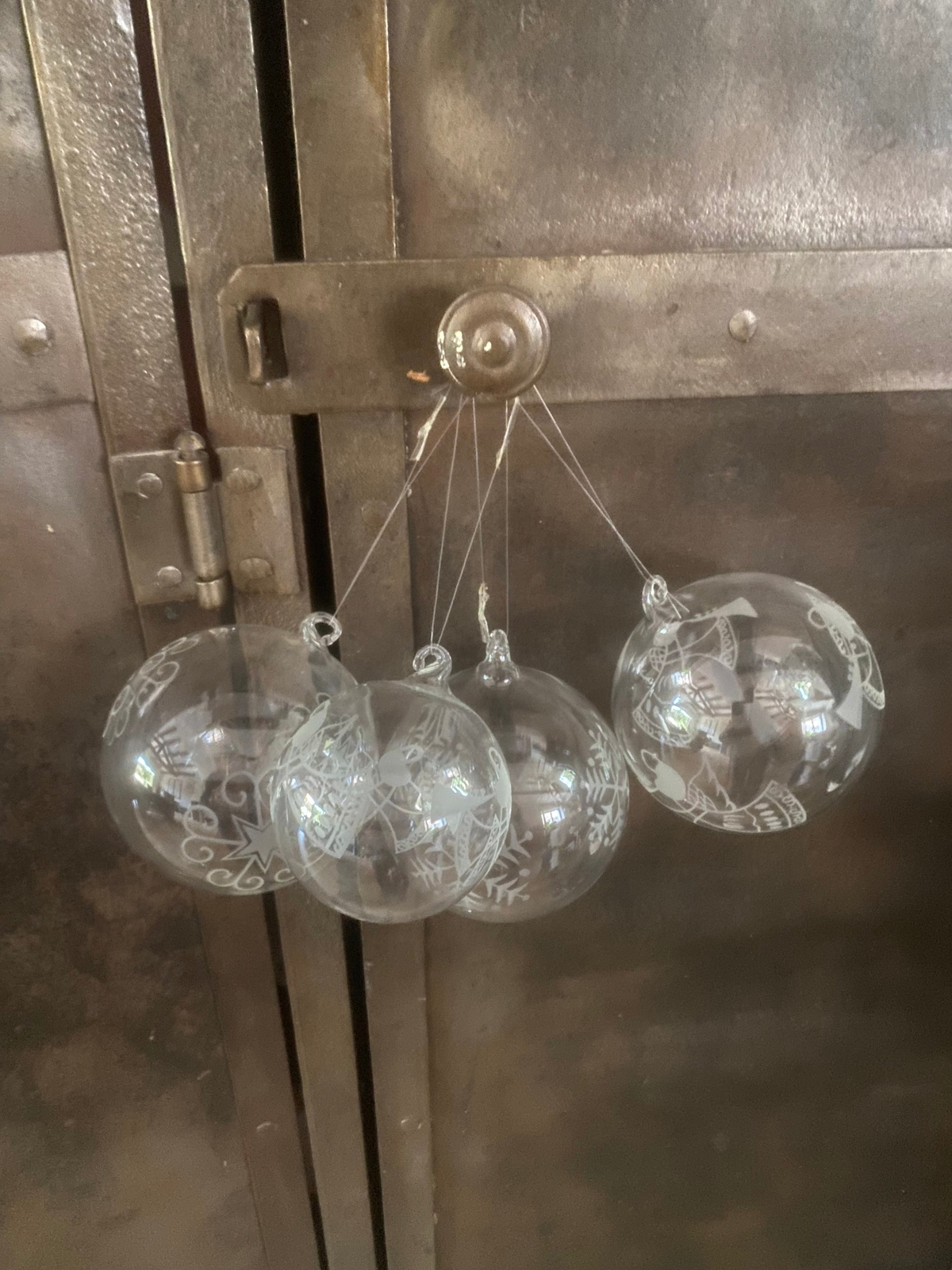 Lot de 3 boules de noel en verre motif étoile flocon et angelot diamètre 7 cm et 1 boule en verre angelot diamètre 6 cm À suspendre verre transparent Très bon etat