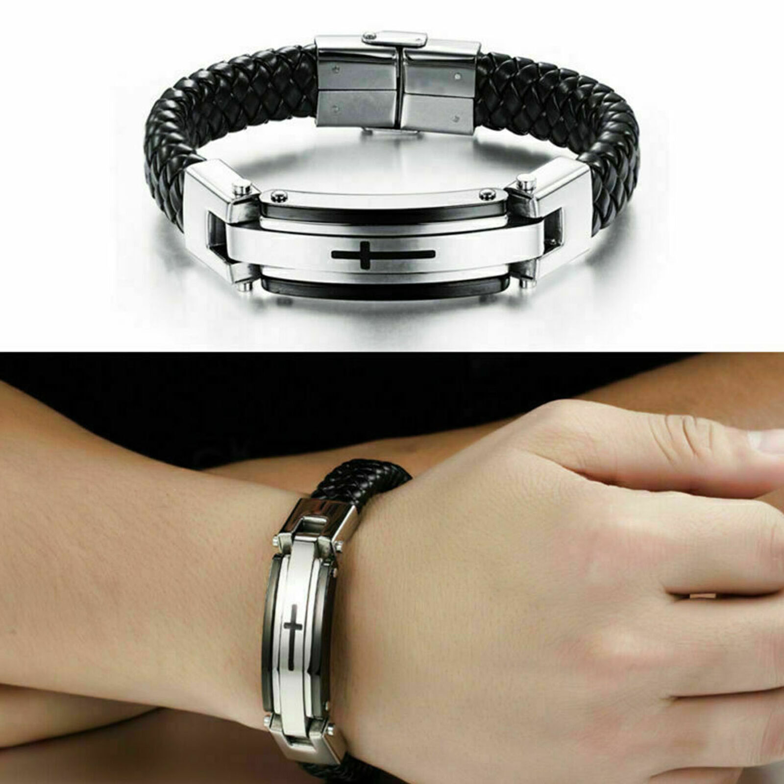 Bracelet en cuir tressé en acier inoxydable pour hommes