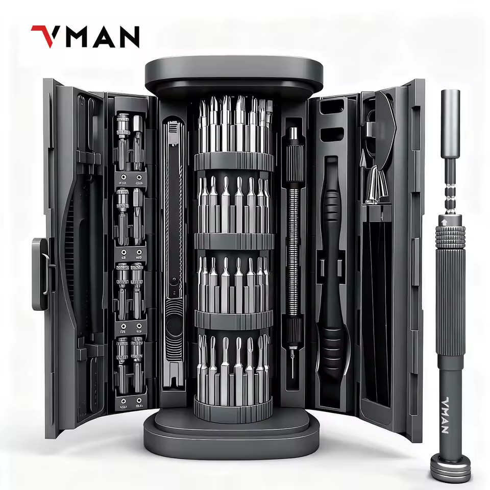 Set de Mini Tournevis de Précision 72-en-1 avec Embouts. The VMAN 72-in-1 Precision Screwdriver Set is available in two versions: one with an electric handle and the other with a non-electric handle.