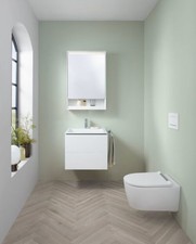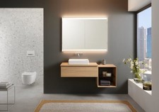 Geberit One armoire à glace 505802007 montage encastré Portes avec miroir des deux côtés avec ComfortLight ambiance lumineuse réglable en continu de la lumière d'orientation à la lumière du jour Les fonctions peuvent être déclenchées via un capteur tactile Tablettes en verre réglables en continu avec 2 prises Compatible avec l'application Maison Commande compatible DALI Degré de protection IP 44 Classe de protection I Tension nominale 230 V CA 50 Hz Couleur de la lumière 2200-4000 K