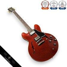 L'essentiel à savoir sur la guitare ES-335 1961 Ultra Light Aged " Sixties Cherry "Réédition fidèle de 1961 par le Custom Shop, finition Murphy Lab " Ultra Light Aged " pour une patine subtile et crédible sans excès.Construction semi-hollow 3 plis érable/peuplier/érable avec bloc central en érable massif, alliant chaleur, définition et sustain maîtrisé.Deux Custombucker Alnico 3 non paraffinés au caractère PAF, contrôlés par 2 volumes/2 tonalités CTS 500 k et sélecteur 3 positions.Manche SlimTaper 60s C à long tenon, touche en palissandre indien et frettes medium-jumbo pour une jouabilité rapide et précise.Une icône des sixties, recréée par le Custom ShopNée à la fin des années 50, la ES-335 a redéfini le format semi-hollow. Cette version " 1961 " reprend l'ère des pans coupés arrondis, des incrustations à points et des courbes élancées. Le vieillissement Ultra Light signé Murphy Lab restitue la patine d'un instrument choyé des décennies, tout en préservant la fiabilité d'une guitare neuve prête à jouer.À qui s'adresse cette ES-335 et pour quels styles ?Taillée pour les guitaristes intermédiaires à professionnels, elle brille en blues, rock classique, soul, pop et jazz. Sa dynamique généreuse et sa résistance au larsen, due au bloc central, en font une partenaire inspirante aussi bien sur scène que dans les contextes studio exigeants.La sonoritéLe laminé érable/peuplier/érable procure attaque et clarté, tandis que le bloc central en érable apporte sustain, focalisation des médiums et tenue impeccable à fort volume. Les Custombucker Alnico 3 non paraffinés délivrent une texture PAF aérée et tridimensionnelle : aigu soyeux, médiums chantants, grave ferme. L'électronique traditionnelle (2 volumes et 2 tonalités à courbe audio, condensateurs Paper-in-Oil) ouvre une large palette, du clean velouté au crunch vintage. L'ensemble ABR-1 et stop bar en aluminium renforce l'attaque, l'articulation des notes et la stabilité d'accordage.Accessoires compatibles recommandésMonte des cordes 10-46 nickel pour respecter l'équilibre d'origine. Un capodastre adapté au radius 12" (304,8 mm) assurera une intonation régulière. Utilise un câble instrument jack 6,35 mm. L'étui rigide Custom Shop est inclus ; ajoute un humidificateur d'étui et une sangle en cuir de qualité. Pour le support, privilégie un modèle à revêtement compatible vernis nitro afin d'éviter toute réaction.Caractéristiques techniquesCorpsFormat : ES-335, semi-hollow avec bloc centralBois : 3 plis érable/peuplier/érableBloc central : érable massifFilets : 1 pli RoyaliteFinition : vernis nitrocellulosique Murphy Lab Ultra Light AgedCouleur : " Sixties Cherry "MancheProfil : SlimTaper 60s CJonction : long tenon, collage à la colle chaudeTouche : palissandre indien, incrustations points pearloidFrettes : 22, medium-jumboDiapason : 24,75" / 628,65 mmRadius : 12" / 304,8 mmSillet de tête : nylon, largeur 1,687" / 42,85 mmAccastillageChevalet : ABR-1Cordier : stop bar en aluminium légerMécaniques : Kluson...