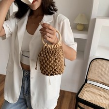 NONE Sac à main d'été en paille tissé à la main pour femme, sacoche de plage en raphia, bohème initié, grand fourre-tout à pompon
