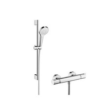 hansgrohe Croma Select S Vario set de douche Numéro d'article 26563400 Type de jet: pluie, TurboRain, IntenseRain Changement de Select pratique Select bouton Select Taille de la pomme de douche: 110 mm pivotant côté douche contre la torsion gênante du tuyau de douche Angle d'inclinaison réglable de 90 °, le curseur pivote à gauche et à droite ainsi qu'en haut et en bas débit maximum (à 3 bar): 15 l / min support mural en plastique chromé