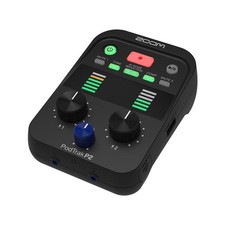 Zoom PodTrak P2, Enregistreur de podcasts, 2 entrées microphone USB-A (5 V, 700 mA) avec contrôle de gain, indicateurs de niveau et bouton Mute, 2 sorties casque stéréo (mini Jack 3,5 mm) avec contrôle de volume commun, Contrôle automatique de la tonalité (EQ & De-Esser) et compresseur, Suppression du bruit de fond contrôlée par l'IA, Intégration facile des correspondant dans le podcast en cours, Enregistrement de 4 pistes sur carte micro SDHC ou micro SDXC, Format d'enregistrement: 24 bits/48 kHz stéréo ou mono, Interface audio USB (USB 2.0) avec 4 entrées et 4 sorties, Port USB-C pour smartphone ou PC, Alimentation via port USB-C, port USB-C supplémentaire (5 V) ou 4 piles AA (bloc d'alimentation et piles optionnels non fournis), Dimensions (L x P x H): 82 x 116 x 43 mm, Poids (avec piles): 226 g